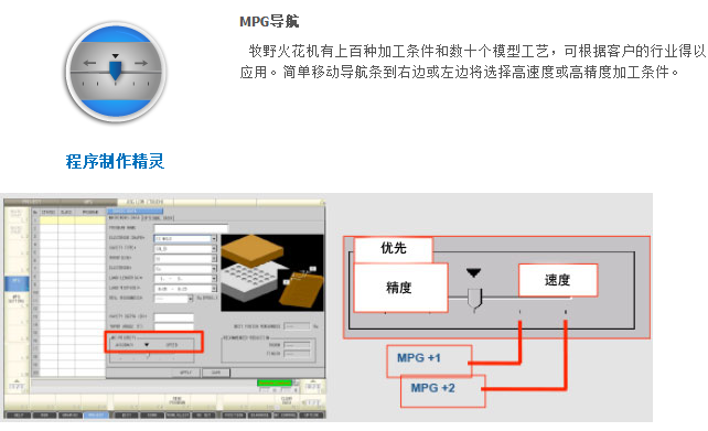 中大型尺寸电火花机床集结牧野先进的加工技术,传递显著的加工性能和提高操作便捷性。牧野火花机有上百种加工条件和数十个模型工艺,可根据客户的行业得以应用。牧野精密电火花机床简单移动导航条到右边或左边将选择高速度或高精度加工条件。