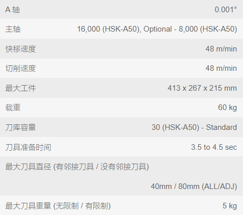拥有一个内置的托盘交换器,使该机床拥有了快速,有效的零件交换-更大限度地提高机器的利用率和更小化零件上下料的时间。标准的A轴旋转工作台还提供了传统立式加工中心通常无法涉及的多角度加工的能力。