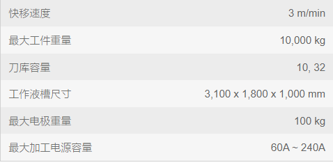 EDNC21机器的工作槽大小为3,100mm x 1,800mm,X/Y/Z行程为2,000mm x 1,500mm x 800mm。该机具有双独立ATC(自动换刀)系统,双独立控制器和双独立电源,方便多工序加工。ATC系统可以配置10或32的刀具库,可以进行长期无人值守的机器操作。EDNC21电火花机床还可配置HS-Rib高速Z轴,实现高达20m/min的跳跃运动。HS-Rib Z轴采用集成的核心冷却滚珠丝杠结构,通过精确的深度控制来保持高速跳跃运动。HS-Rib系统的效率优势可以将循环时间减少高达60%,这使得大型EDNC21机床能够实现比其小得多的机床具有的功能。